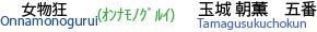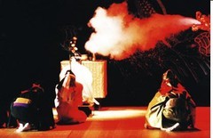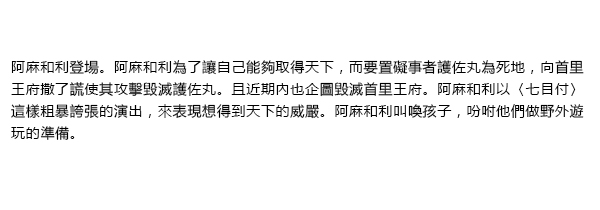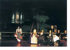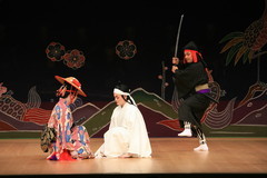 あまおへ(阿麻和利)が登場します。阿麻和利は、自分が天下をとるために、邪魔者であった護佐丸を亡き者にするために首里王府に嘘偽りを言って攻め滅ぼさせました。さらに、近い内に首里王府も滅ぼそうと企んでいます。天下を欲しいままにしている威厳を、阿麻和利は〈七目付〉という荒事で表現します。阿麻和利は供を呼び出し、野遊びの準備を言いつけます。![]() ![]() |