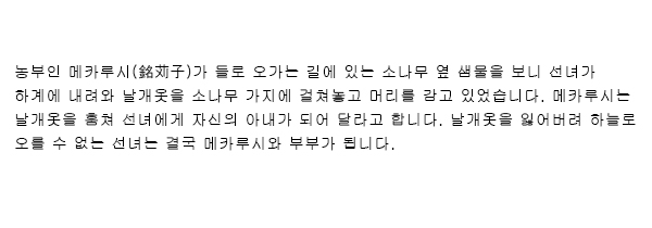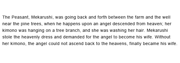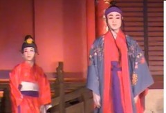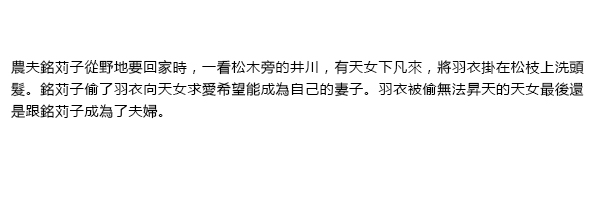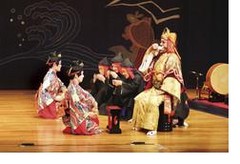 農夫の銘苅子が野良の行き帰りに松の木の側の井川を見ると、天女が下界に下りてきて、羽衣を松の枝に掛けて髪を洗っています。銘苅子は羽衣を盗って、天女に妻になるように言い寄ります。羽衣を盗られ昇天できない天女はとうとうと銘苅子と夫婦になります。![]() ![]() ![]() |
