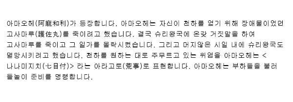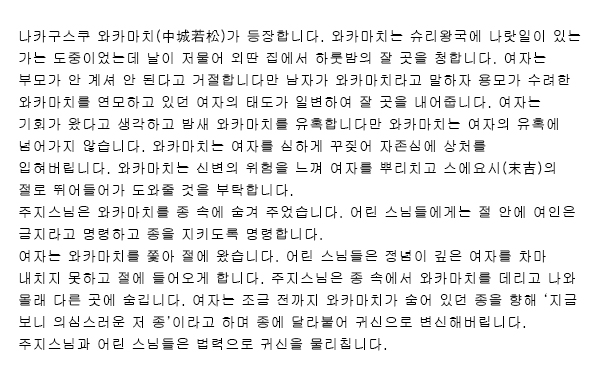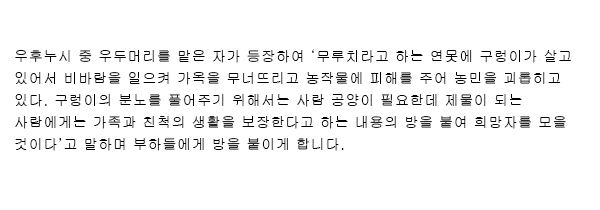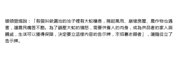 頭取が登場して、「漏池(ムルチ)という池に大蛇が棲んでいて風雨を巻き起こし、家屋を崩したり、農作物に被害を与えたりして農民を苦しめている。大蛇の怒りを鎮めるために人身供養が必要であり、生け贄になった者の家族や親戚には生活の保障をするという内容の高札を立てて希望者を募ることにする」ということを申して供に高札を立たせます。![]() ![]() |