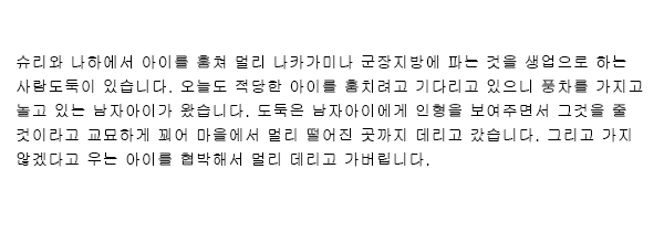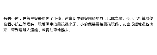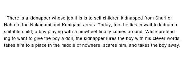 首里や那覇で子供を盗み、遠く中頭や国頭方面に売ることを生業としている人盗人がいます。今日も適当な子供を盗もうと待ち受けていると、風車で遊んでいる男子がやって来ました。盗人は男子に人形をくれると見せかけながら、ことば巧みに誘い出して、人里離れた所まで連れて行き、おどかして連れ去ってしまいます。![]() ![]() ![]() |