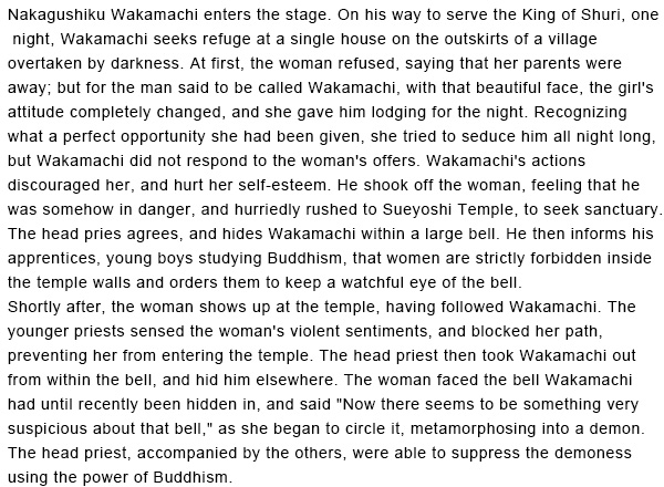 中城若松が登場します。若松は、首里王府にご奉公に行く途中、行き暮れて村はずれの一軒家に一夜の宿を乞います。女は親が留守だといって断りますが、男が若松だと名乗ると、その美貌の若松に恋慕していた女の態度が一変し、宿を貸します。女は好機到来とばかりに若松を終夜誘惑しますが、若松は女の誘いに応じません。若松は女を罵倒し、自尊心を傷つけてしまいます。若松は身の危険を感じ女を振り捨てて、末吉の寺に駆け込み、救いを求めます。 座主は若松を鐘の中に隠し、小僧たちに寺内は女人禁制であることを言い付け、鐘の見張りを命じます。 女は若松を追って寺にやって来ました。小僧たちは、情念の激しい女を拒みきれず、寺に入れてしまいます。座主は鐘の中から若松を連れ出して、かくまいます。女は、先ほどまで若松が隠れていた鐘に向かって「今に不審なあの鐘」といって、鐘にまとわりつき、鬼女に変身してしまいます。座主と小僧たちは、法力によって鬼女を鎮めます。 ![]() ![]() ![]() |